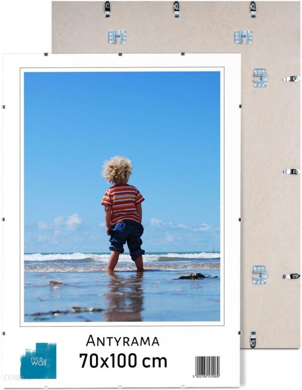 Plastikowa antyrama o rozmiarze 70×100 cm Prezentujemy Państwu dużą antyramę plexi, o wymiarach 70×100 cm. Idealna do oprawy dużych prac. Nie posiada powłoki antyrefleksyjnej, produkty w nią wyposażone znajdą Państwo w innej kategorii w naszym sklepie. Zalety antyram pleksi Antyramy plexi charakteryzuje mniejsza waga niż ich odpowiedników, które są wyposażone w szklany front. Są one również uważane za bardziej odporne na uszkodzenia oraz pęknięcia w porównaniu do szklanych antyram. Konstrukcja antyram plastikowych opiera się na dwóch, połączonych ze sobą, części. Tył stanowi płyta HDF o grubości 3mm, której boki malowane są specjalną białą farbą dla lepszej estetyki, a przód ochrania wysokiej jakości szyba z pleksi. Antyramy wyposażone są również w klipsy dociskające obie warstwy oprawy. Dzięki mniejszej wadze, antyramy z plexi mogą być stosowane w oprawie prac o największych formatach. W naszym sklepie oferujemy Państwu antyramy w popularnych rozmiarach od 5×5 cm do 70×100 cm. Jeśli chcą Państwo oprawić pracę o nietypowym rozmiarze, polecamy nasze produkty na indywidualny wymiar.